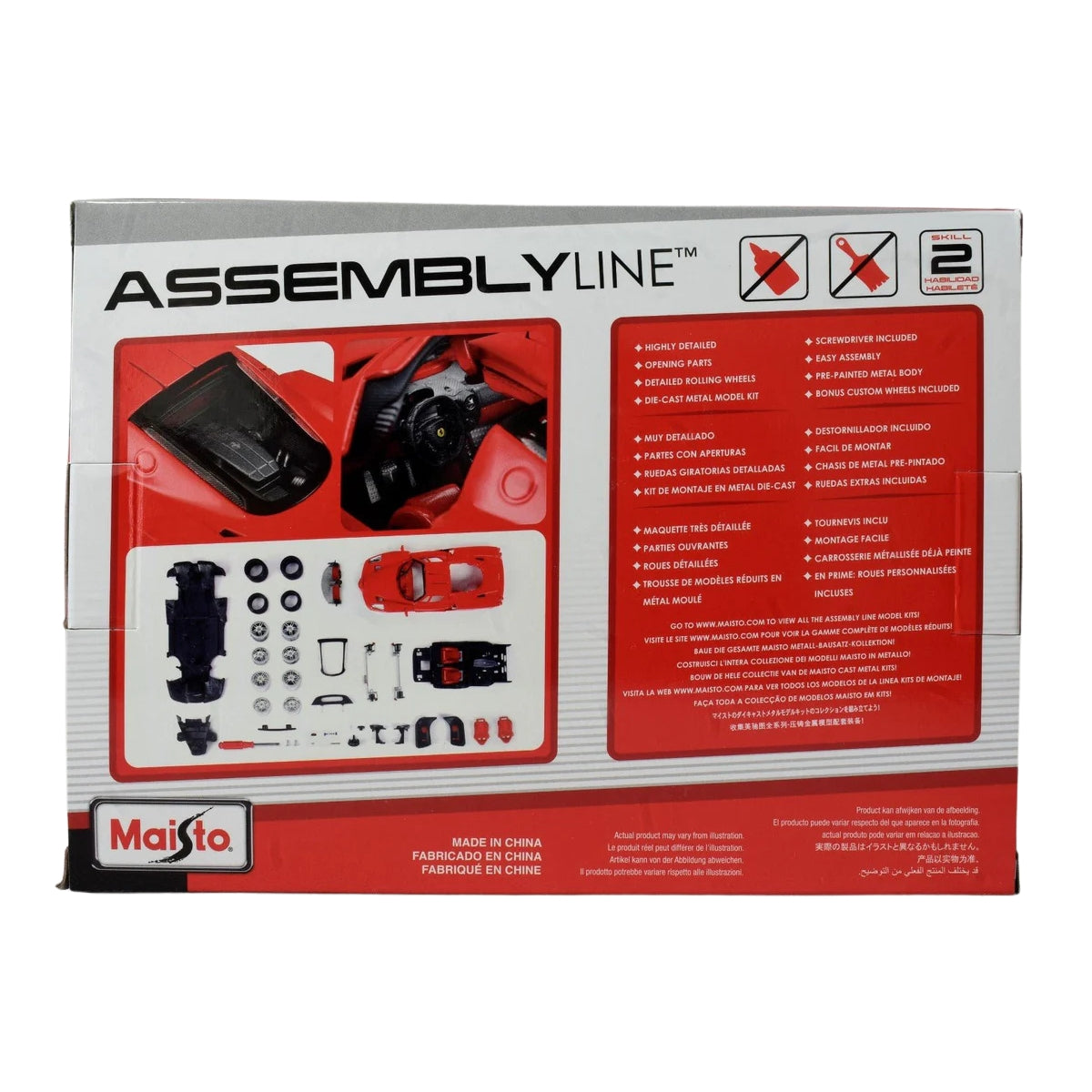 Crafted with a durable die-cast metal body, authentic Rosso red finish, and detailed interior components, this kit delivers an impressive display model once assembled—no glue or paint required. Multiple wheel options, precise fitment, and Maisto’s intuitive assembly design make it perfect for builders of all ages, from young enthusiasts to serious collectors.