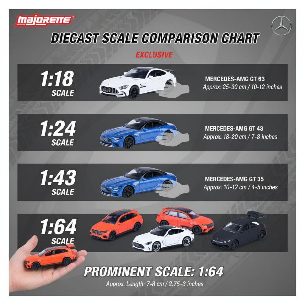 The 1:64 scale is the perfect size; small enough to collect dozens without taking up too much space, yet large enough to appreciate the authentic Mercedes-Benz & AMG Exotic Car details. These models fit comfortably in both adult and child hands, making them ideal for display or play.