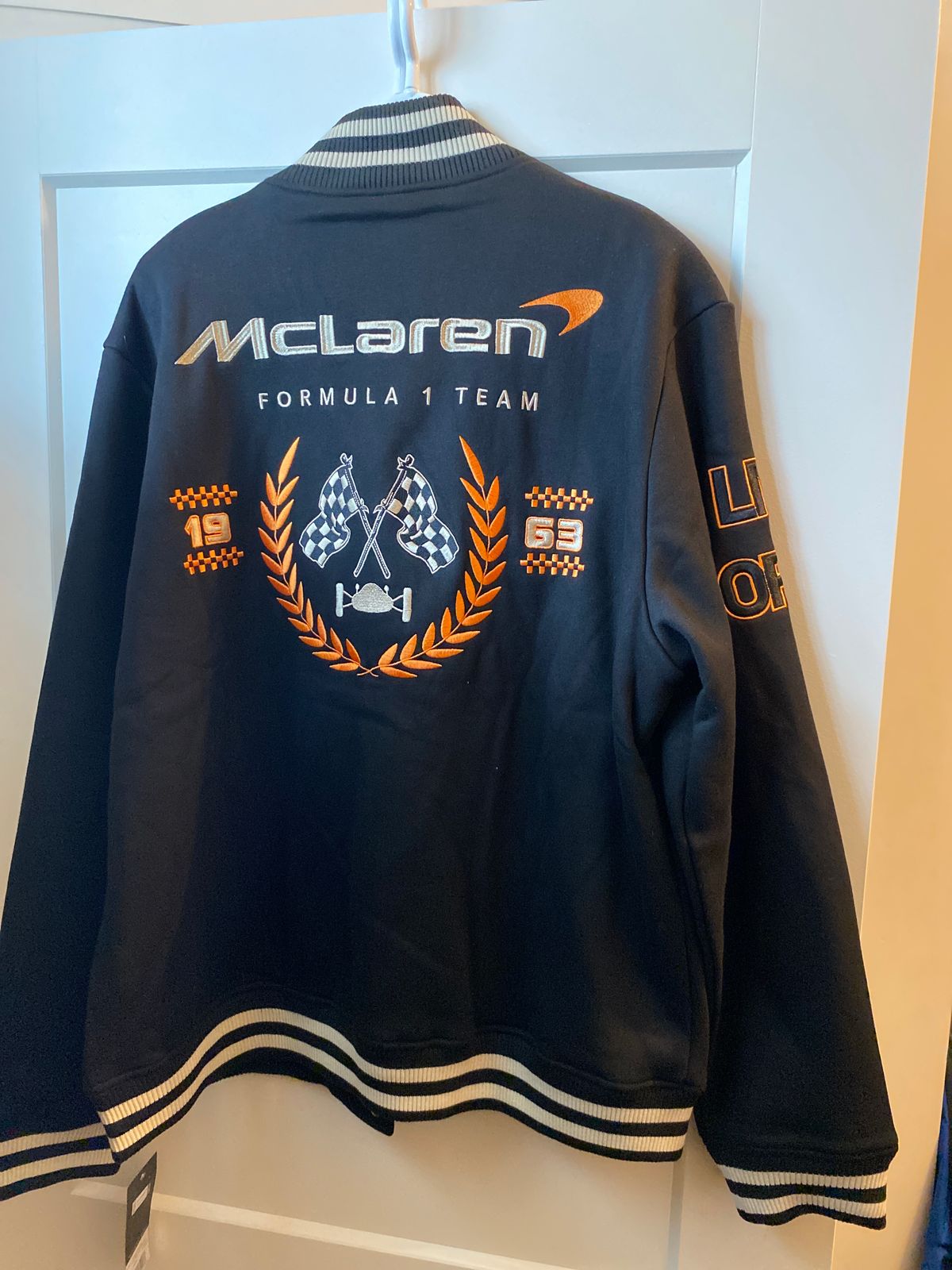 With its classic varsity silhouette, ribbed cuffs, and timeless black finish, this jacket is a must-have for any McLaren fan who wants to wear their passion with pride.